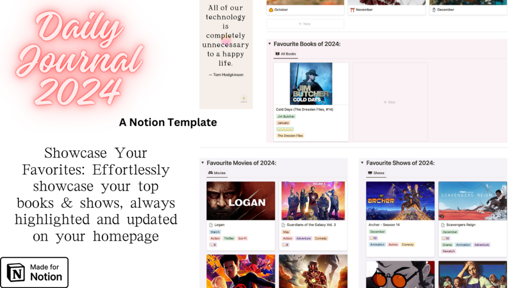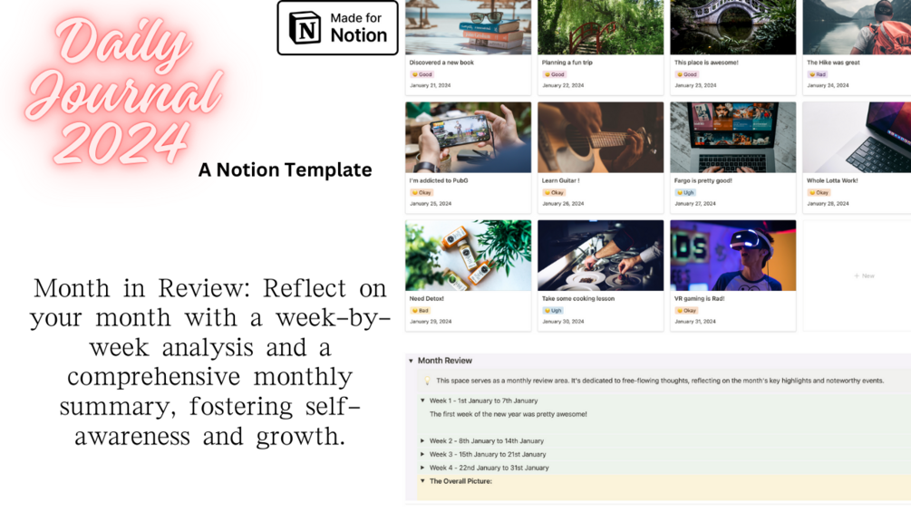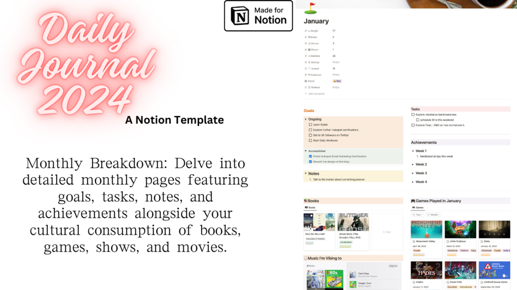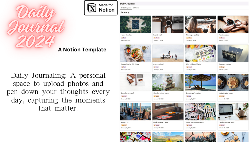 Designed for the avid journaler, the meticulous planner, and everyone in between, the "Daily Journal 2024 | Notion Personal Diary" is more than a template—it's a companion on your path to living a richer, more organized life. Available for you to own on Gumroad and the Notion Template Gallery, it's time to turn every day into a meaningful narrative. Elevate your daily routine into an art form with this exquisitely designed Notion template.