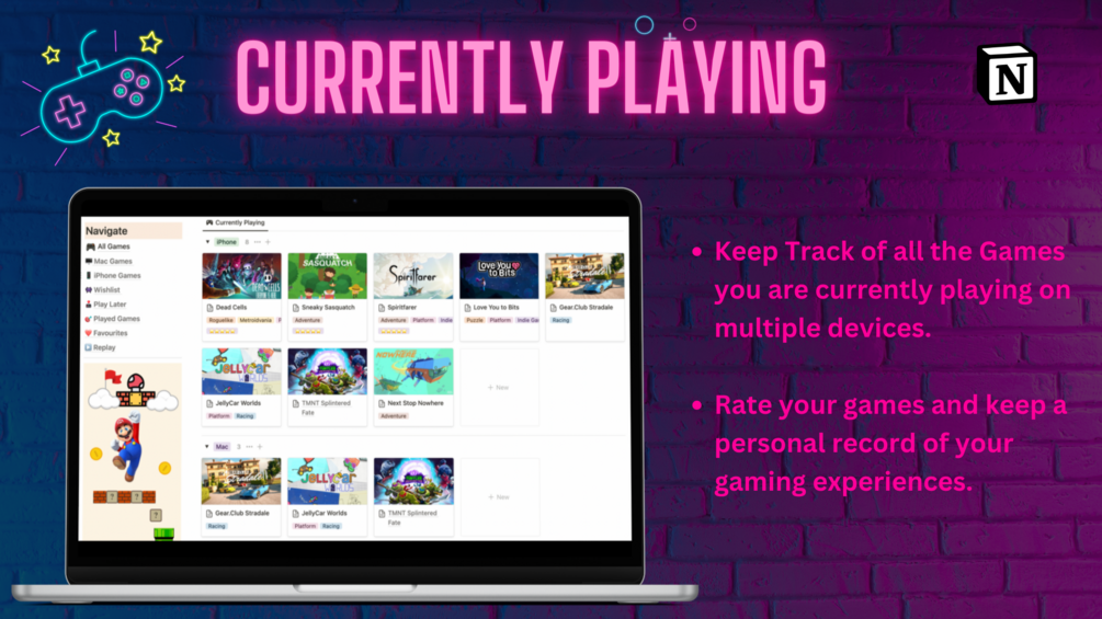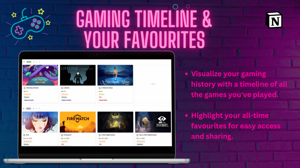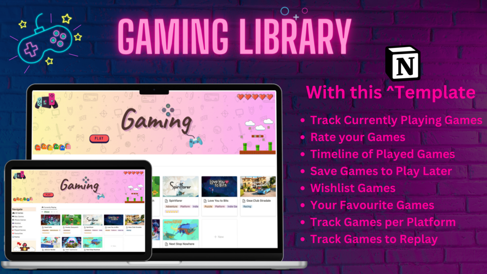 This isn't just a dashboard, it's a comprehensive tool designed to enhance your gaming experience. Here's what it offers: 🎯 Track your Currently Playing Games ⭐ Rate all your Games 🕰️ Get a Timeline of your Played Games 🔖 Save Games to Play Later 📝 Wishlist Games ❤️ Track Your Favourite Games 🎮 Track Games as per Platform 🔄 Track Games to Replay Whether you're a casual gamer or a hardcore enthusiast, this template is designed to cater to your needs, providing a sleek, minimalistic view of your gaming journey.