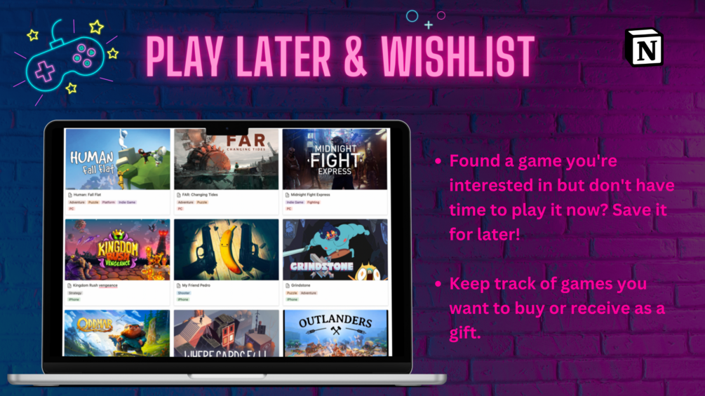 - Wishlist Games: Keep track of games you want to buy or receive as a gift.